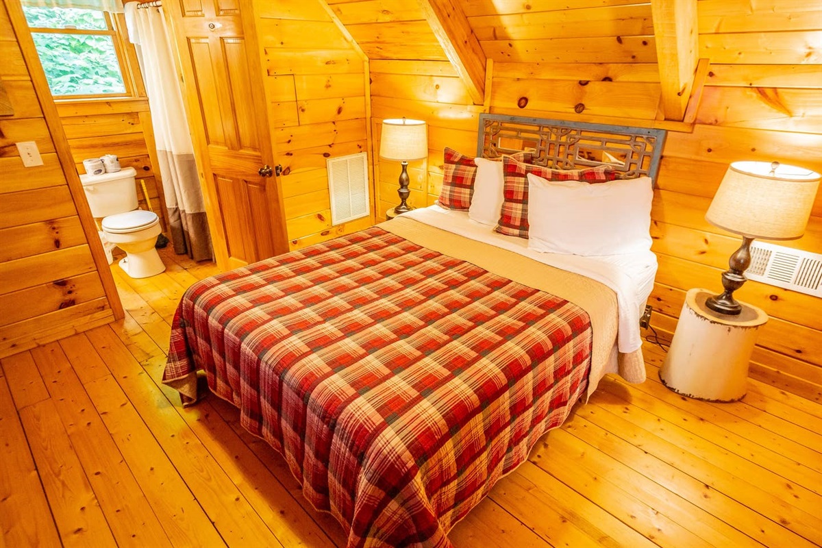 The master BR with a king bed and full bath is on the main level. The second BR is upstairs with a queen bed and full bath. There are 2 built-in twins upstairs outside of the enclosed second BR.