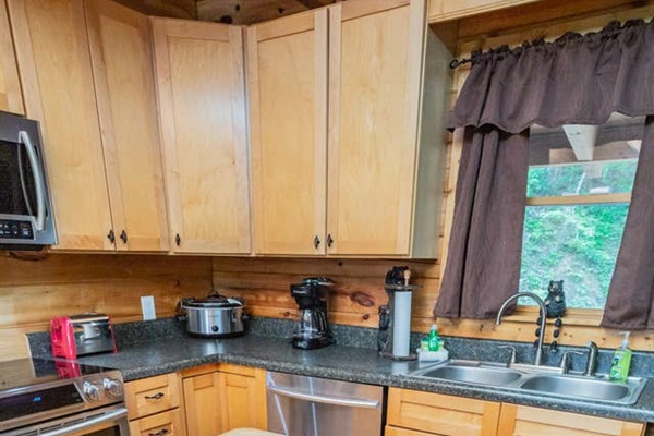 The kitchen is fully stocked with pots, pans, bakeware, cookware, silverware, drinkware and a coffee maker. There is a microwave, oven and fridge as well as a slow cooker! You can cook family meals with all the items you need.