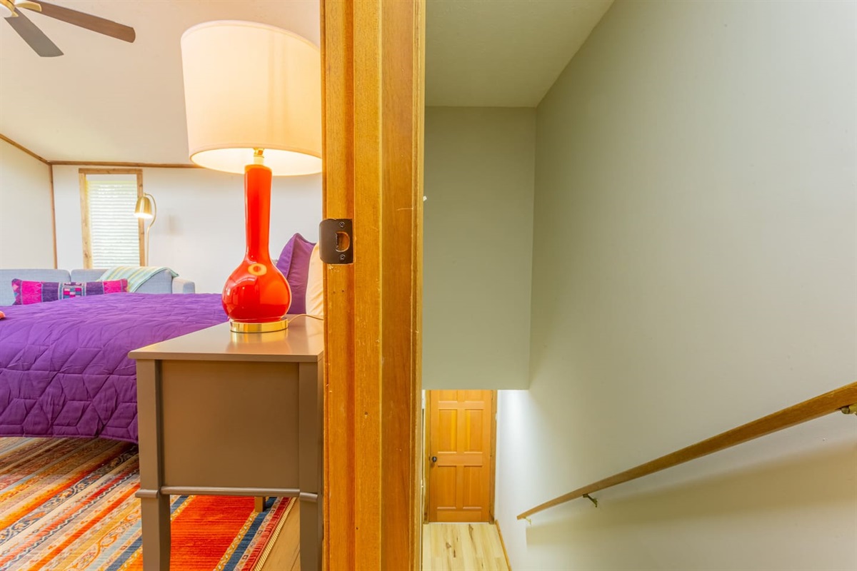 Master Bedroom (Sleeps 2 on a queen bed) – located on the upper level (upstairs). There is a connected full bathroom with a jacuzzi tub / shower combo (step up, step down style). There is a 55” TCL Smart TV with Roku and streaming apps to login with your own accounts. There are 2 closets: 1 walk-in closet is for guest use and 1 is a no-access supply closet.
