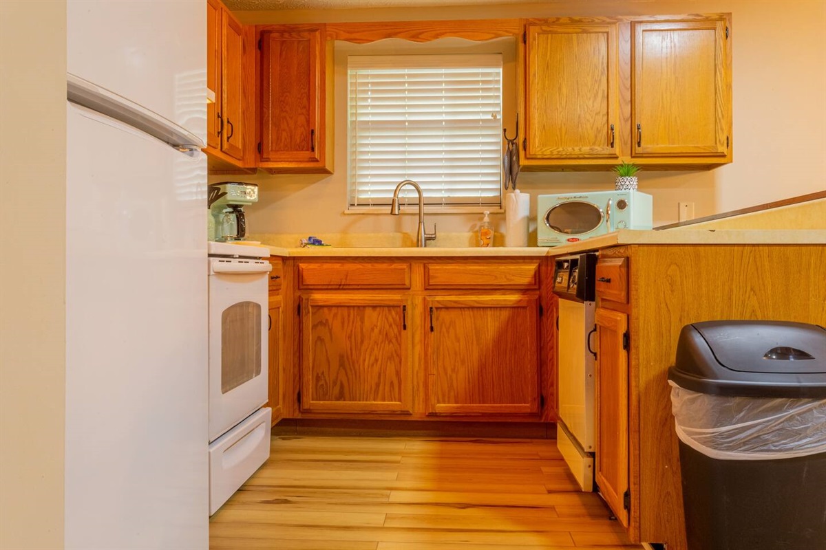 Kitchen – Main level. The kitchen is fully stocked with a fridge/freezer, pots, pans, slow cooker, microwave, cookware, silverware, plates and cups. Everything you need to make meals!